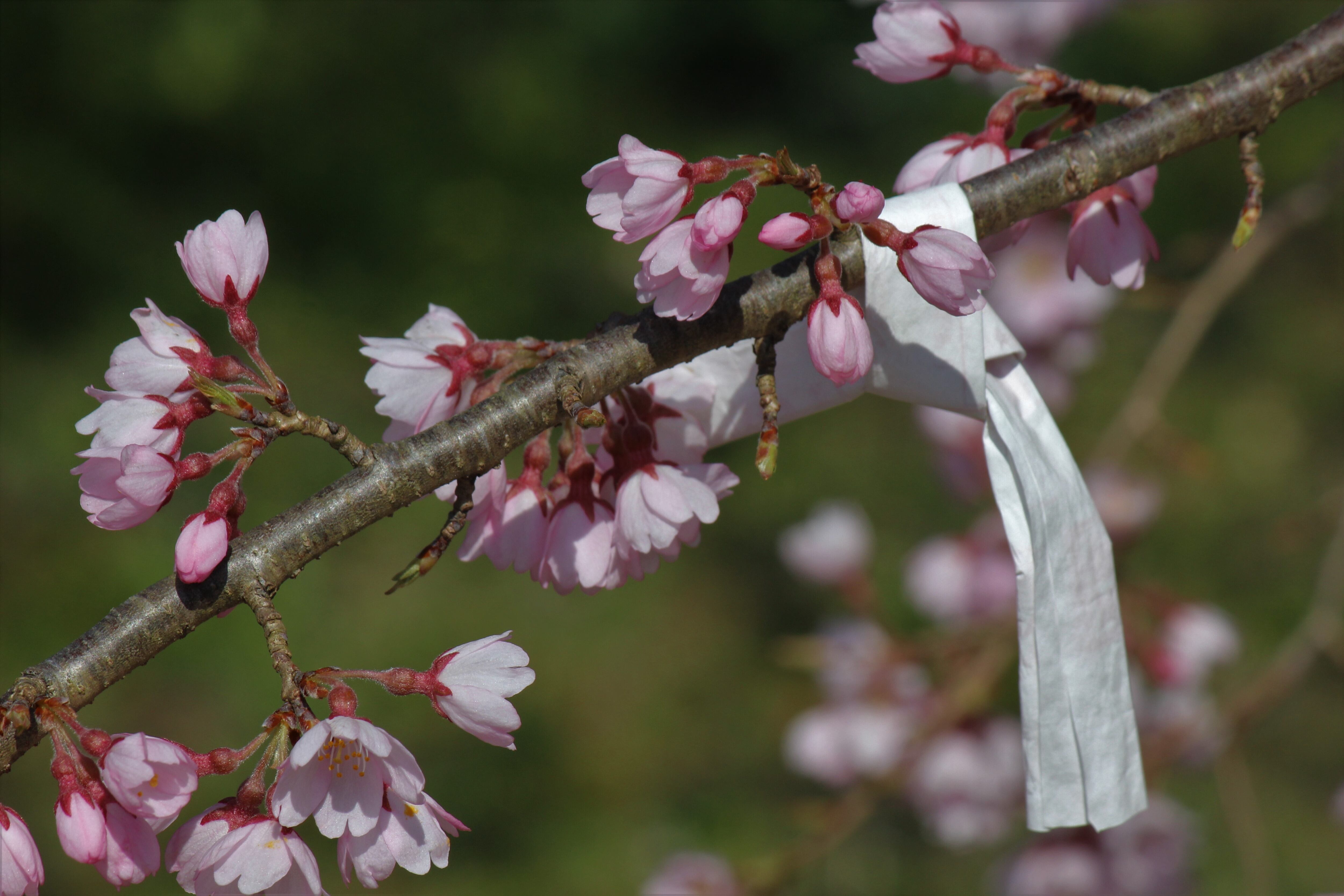 三重塔前のしだれ桜の老木から開花が始まり、境内各地にあるヤマザクラに開花が広まります。大法寺が一年で最も美しい時期となります。
