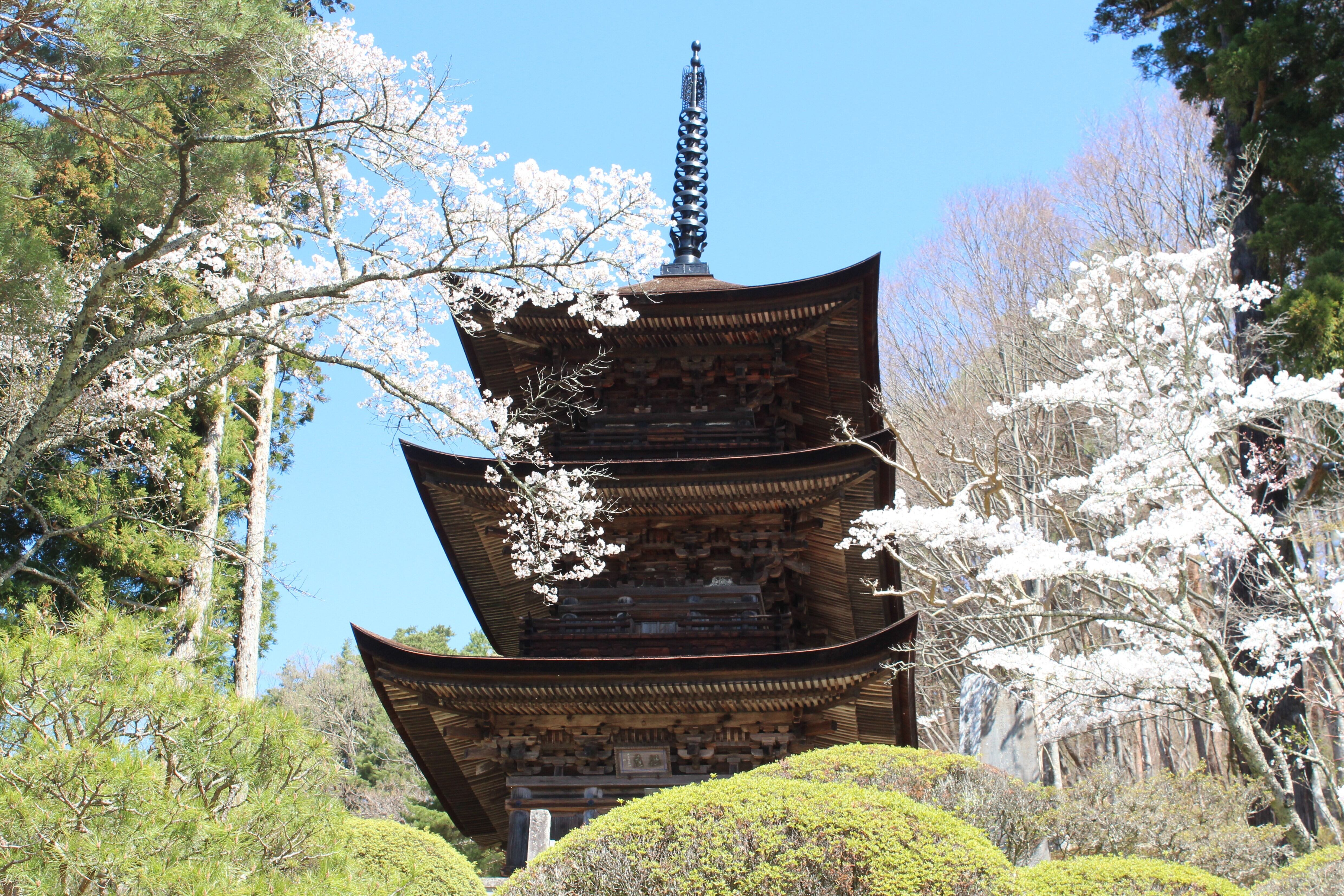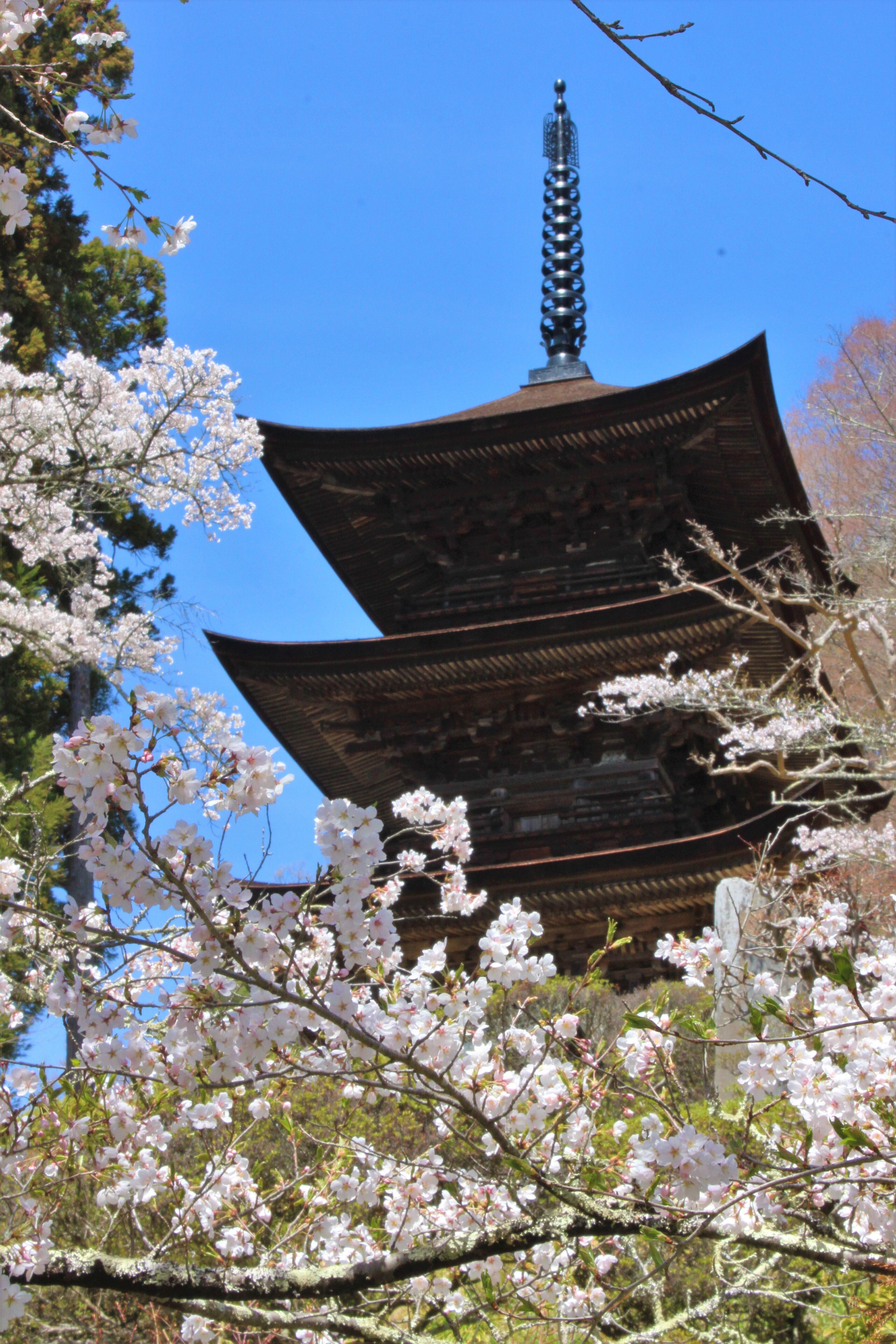 三重塔前のしだれ桜の老木から開花が始まり、境内各地にあるヤマザクラに開花が広まります。大法寺が一年で最も美しい時期となります。