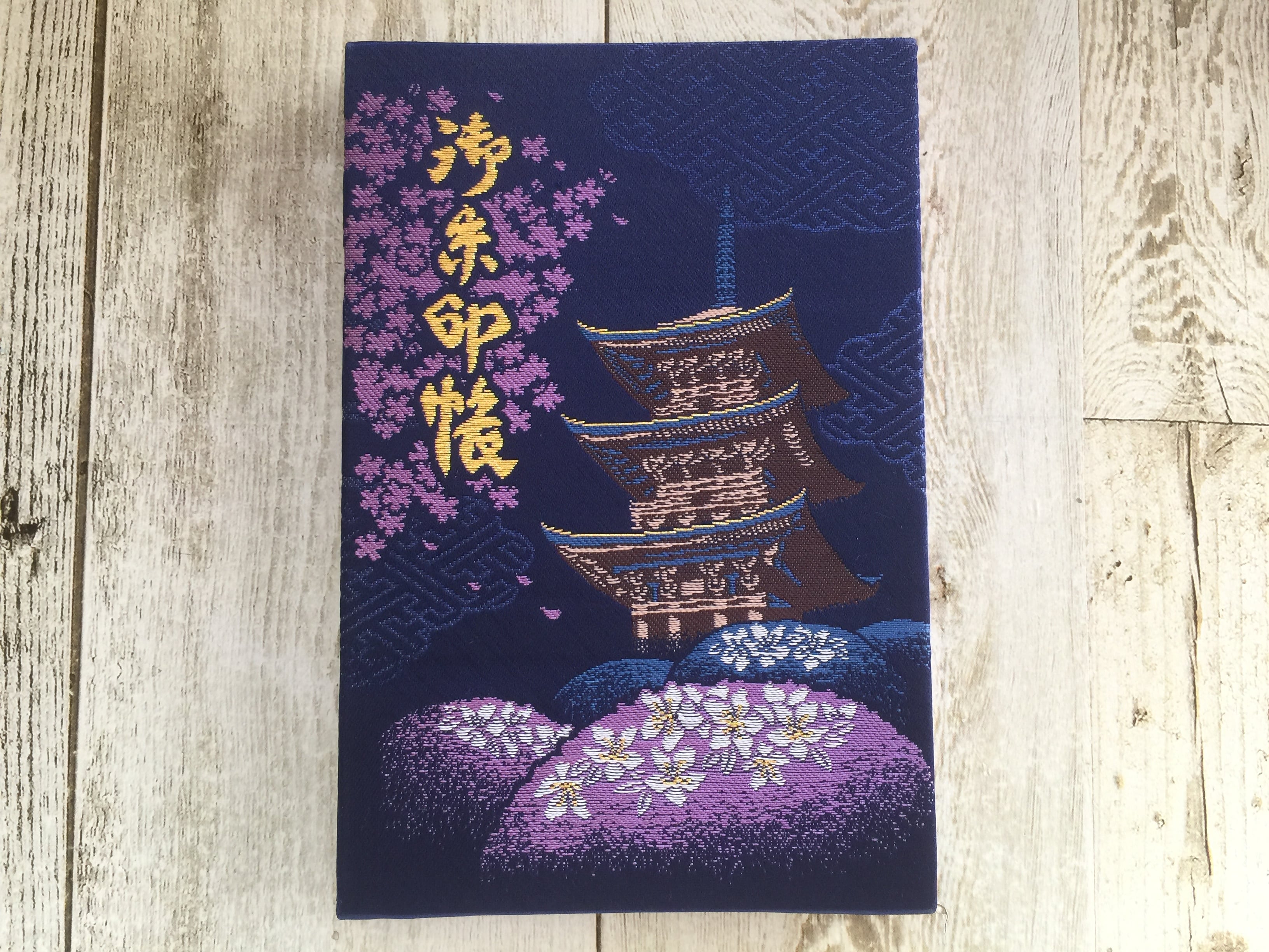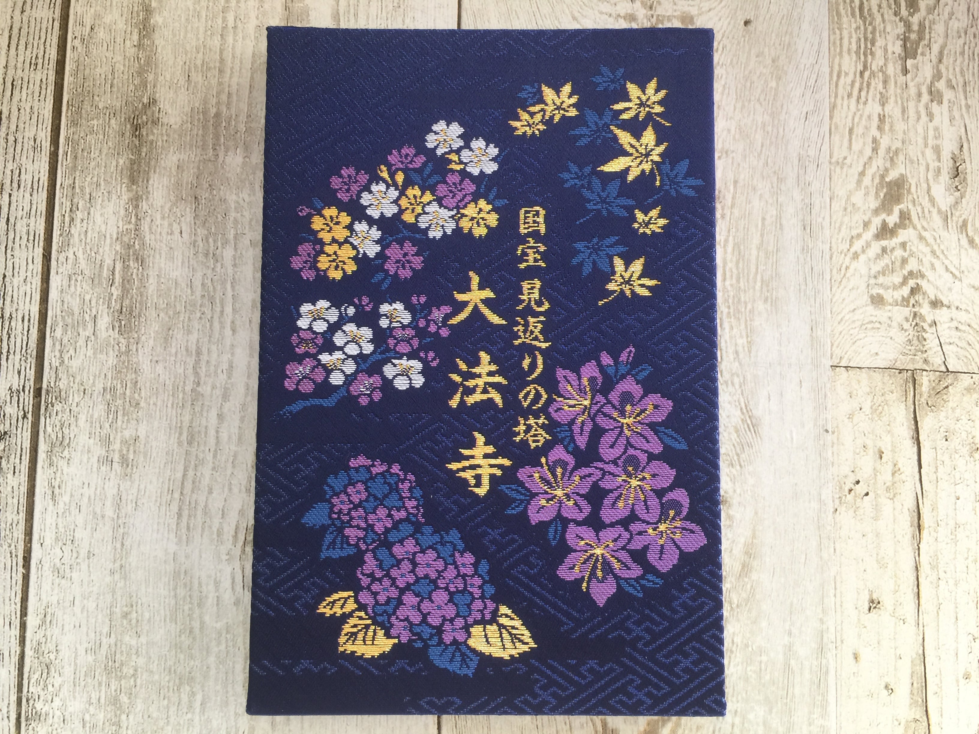 見返りの塔の名で親しまれる国宝三重塔をデザインしております。大法寺境内に咲く、さくら、さつき、あじさい、もみじもあわせて描かれており、四季の変化も感じていただけます。西陣織で製本されており、印刷では実現できない上品な質感が、国宝三重塔の高い格調と四季の美しさを再現いたしております。
