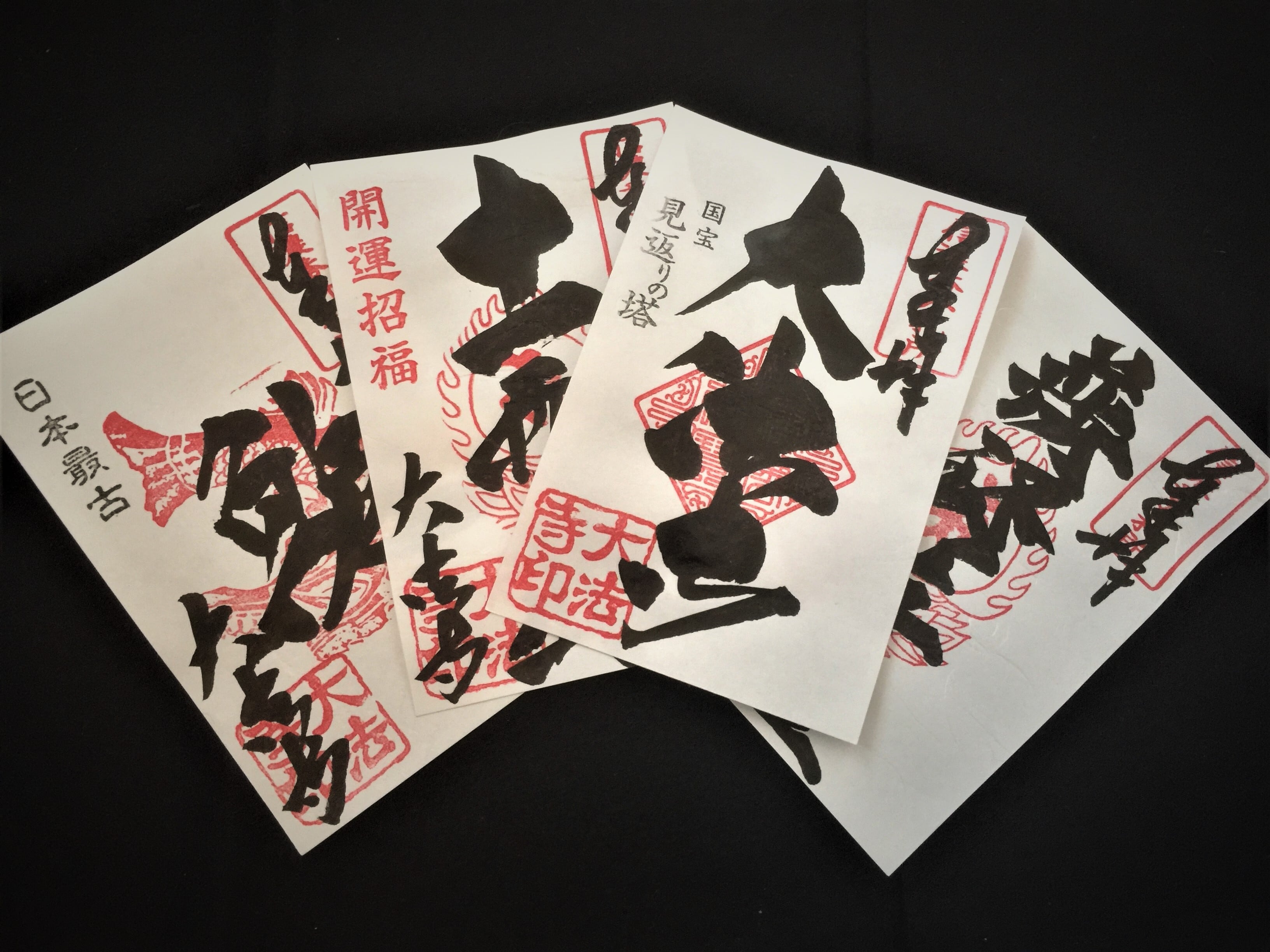 「大法寺」「十一面大悲」「普賢菩薩」「鯱」の通常御朱印(白地)の四体セットです。